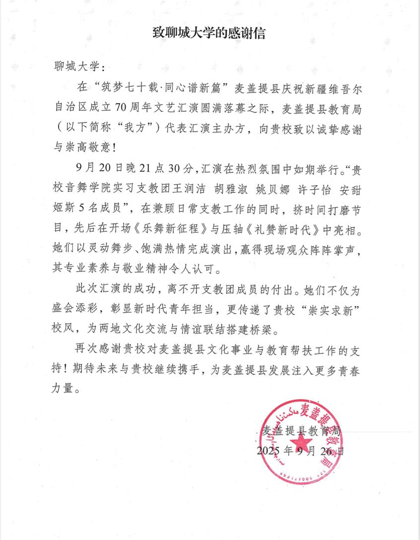 国庆前夕,一封来自新疆麦盖提县教育局的感谢信跨越千里,为太阳成集团官网援疆支教工作增添了一抹温暖而厚重的注脚。信中,麦盖提县教育局代表“筑梦七十载 同心谱新篇”文艺汇演主办方,向太阳成集团官网音舞学院实习支教团致以诚挚感谢与崇高敬意,高度肯定他们在当地文化事业发展与教育帮扶工作中给予的有力支持,并热切期待未来能继续携手同行,共绘麦盖提县高质量发展新蓝图。