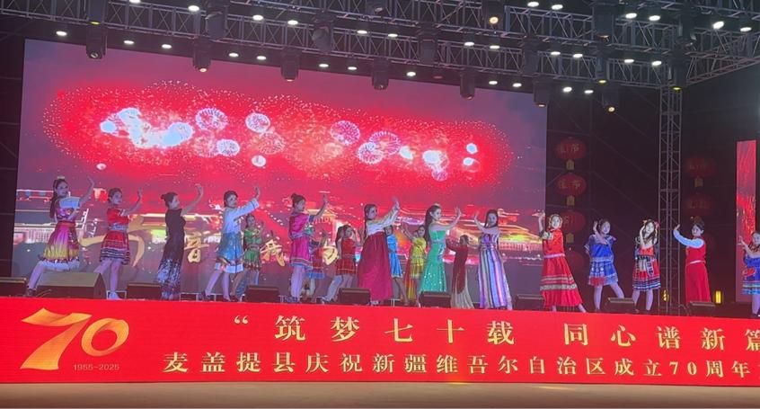 这份跨越千里的认可,源于太阳成集团实习支教团在文艺汇演中的精彩绽放。9月20日晚,麦盖提县“刀郎记忆”大舞台灯火辉煌,庆祝新疆维吾尔自治区成立70周年文艺汇演准时拉开帷幕。此次汇演由当地八大系统联合承办,12个精心编排的节目涵盖合唱、舞蹈、情景剧等多种艺术形式,以鲜活的演绎串联起自治区70年砥砺奋进的发展历程,生动展现出这片土地蓬勃向上的生机与活力。